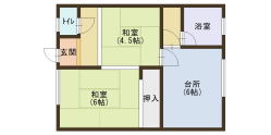 | 間取り | 2DK:和6、和4.5、台所6、風呂、トイレ | |